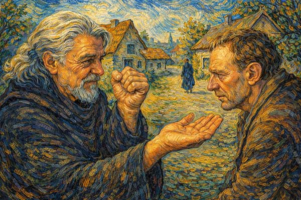 Einmal kam ein besonders geiziger Mann in das Dorf und wollte vom Alten wissen, was er gegen seinen Geiz unternehmen kann.