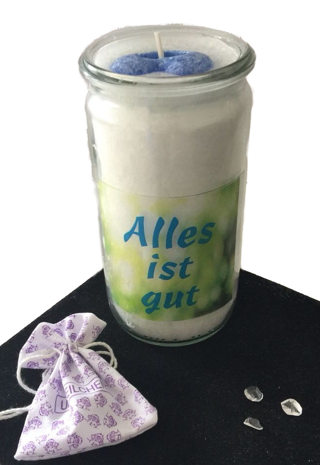 Worüber ich heute besonders glücklich bin, ist eine neue Kerze, die ich entwickelt habe. Sie ist weiß und brennt mit einem blauen Wachsspiegel ab. Zauberei denken manche, ich verrate Ihnen später einmal wie ich es geschafft habe, dass sich das weiße Wachs beim Abbrennen blau einfärbt. Wenn dann die Kerze nach ca. 80 Stunden Brennzeit ganz ausgebrannt ist, finden Sie drei kleine lupenreine Bergkristalle: Dafür gibt es natürlich ein kleines Säckchen, damit sie diese bei sich tragen können. Denn die Kristalle sind aufgeladen mit einer wunderbaren Schwingung, die uns immer wieder in den Zustand bringt: „Alles ist gut“. Das ist auch das Thema der Kerze und ein schöner Aufkleber ziert das Glas, so dass Sie immer wieder lesen können „Alles ist gut“.